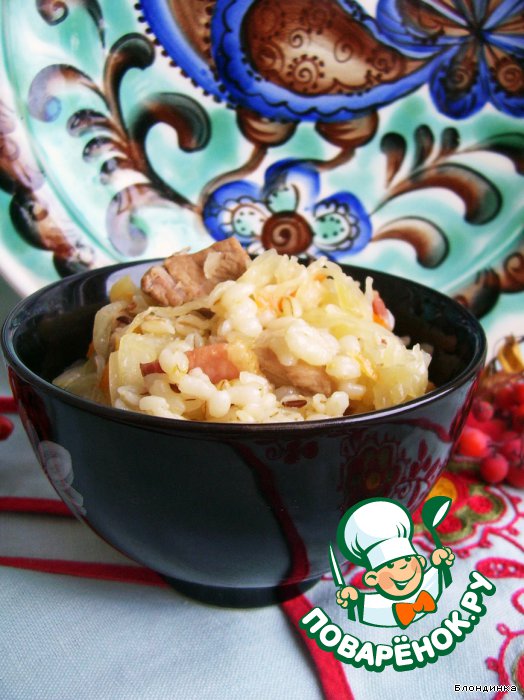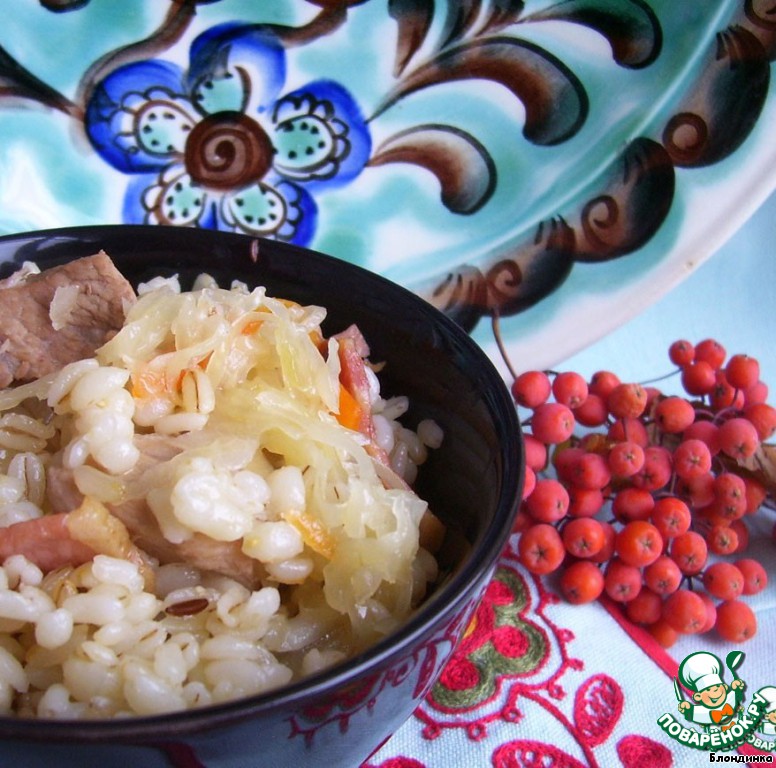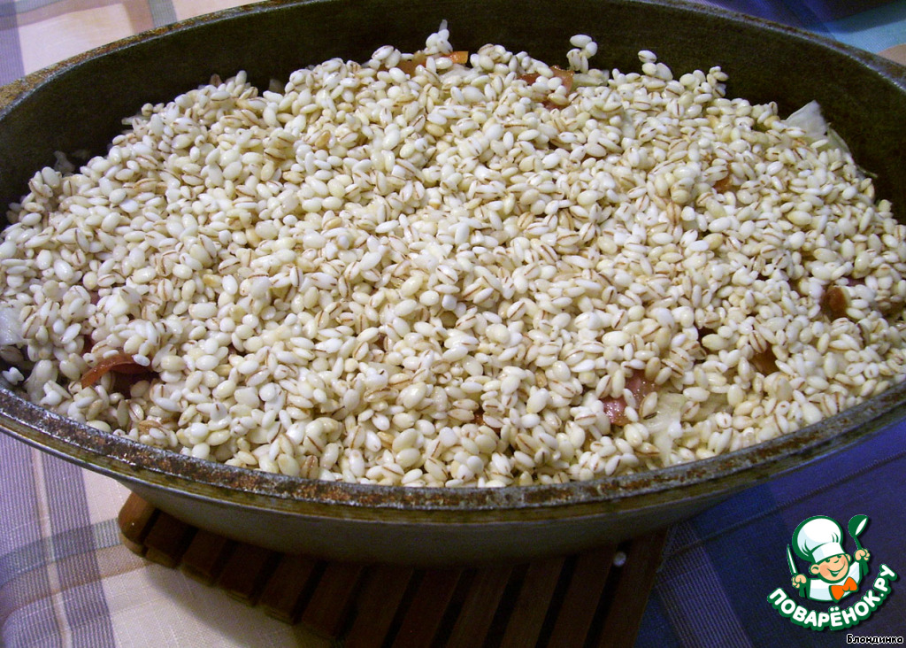 Поверх капусты выкладываем наш обжаренный бекон (честно говоря, это моя отсебятина, мне хотелось чтоб перловка чуточку пропиталась копчененьким, можно бекон оставить вместе с мясом), высыпаем перловку, предварительно тщательно промытую. Теперь заливаем будущий мульгикапсад водой так, чтоб вода покрыла капусту. Закрываем крышкой и можно отправлять в разогретую духовку примерно на 1 час 20 минут. В некоторых источниках советуют делать мульгикапсад на плите, но я решила, уж поскольку блюдо национальное, делать его в духовке (за неимением печи).