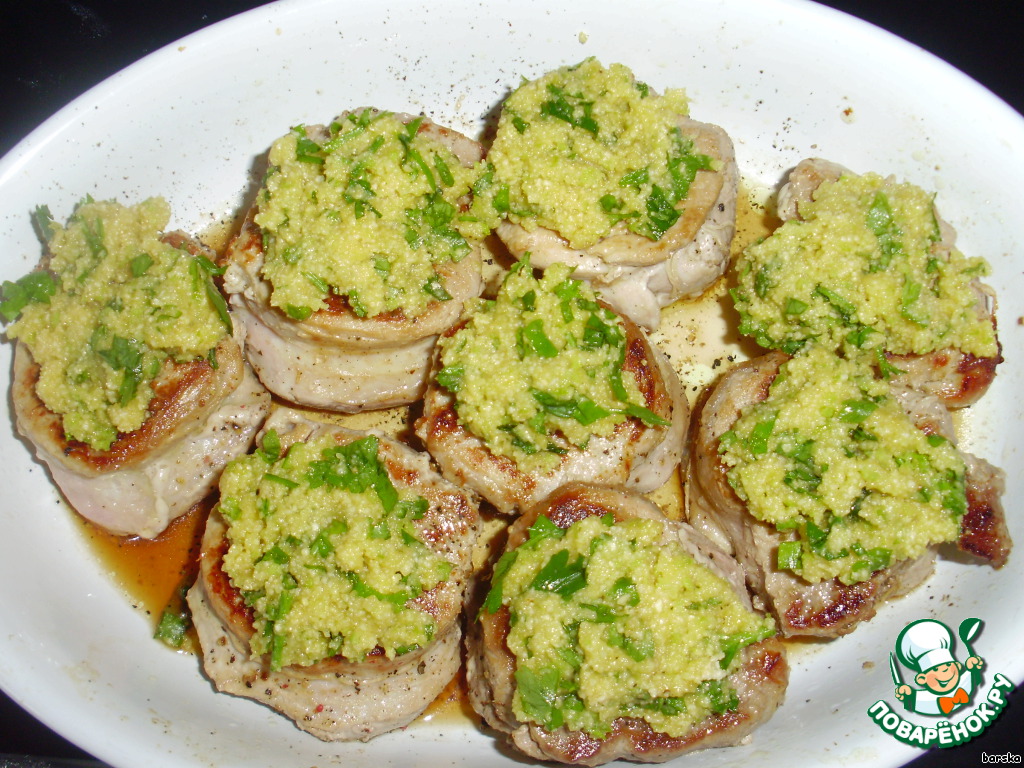 Свиное филе нарезать толстыми кусочками и связать кулинарной или обыкновенной ниткой, сложенной в несколько слоёв, придавая медальонам круглую форму.