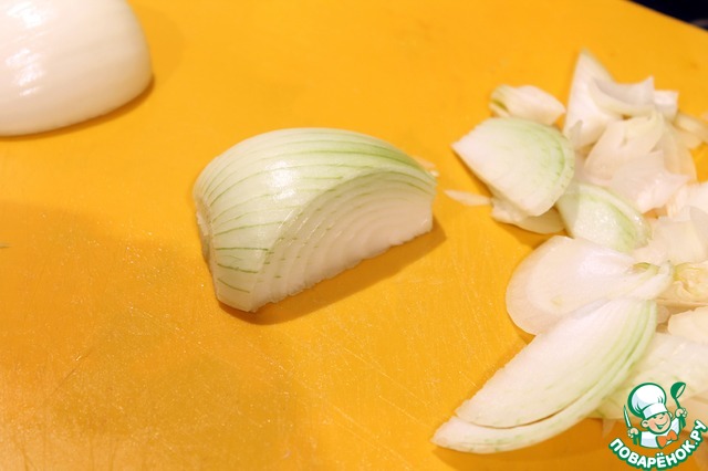 Пока мясо обжаривается. Лук нужно почистить и нарезать именно так, как показано на фото. Муж сказал, что это очень важно.