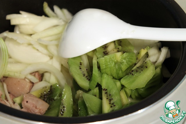 Спустя 20 минут наше мясо слегка обжарилось и пустило много сока. Теперь пришло время добавить к нему лук, киви, лимонный сок и сахар. Все тщательно перемешать и закрыть крышкой.