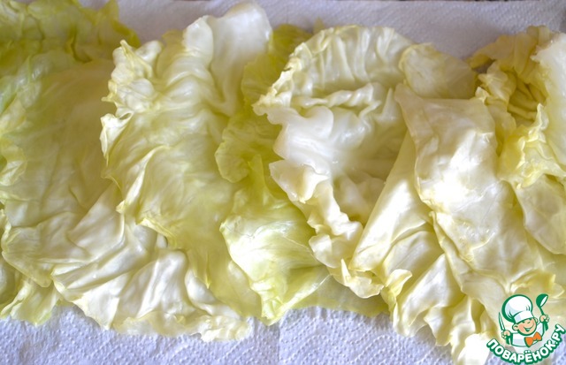 2. Капусту опустить в кипяток на две минуты, снять верхние листья, отправить обратно в кипяток и снять новые обмякшие листья. Повторить с оставшейся капустой. Обсушить капустные листья на бумажных салфетках. Перья зеленого лука обдать кипятком.