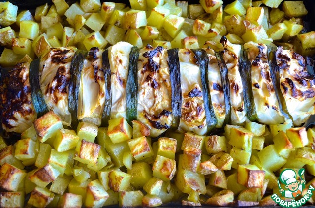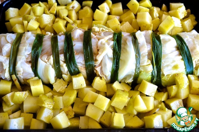 | Мясо, приготовленное таким образом, сохраняет свою сочность благодаря маринаду и «обертки» из капустных листов. Оно получается очень нежным и ароматным. Кубики картошки с хрустящей корочкой – отличный гарнир для такого мяса. |