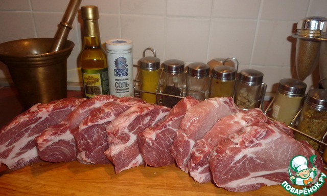 Ну что же, приступим. Возьмем кусок свиной шейки, килограммчика на полтора. Посмотрите, какая красавица. Мягкая, сочная, не побывавшая в цепких лапах морозильной камеры и с такими аппетитными прослойками жира. Только не хватайтесь за голову, не говорите, что кушать жирное вредно. Жир вытопится и его останется не так уж много, а останется вкусная питательная свининка, которая поможет нам восстановить силы после долгой холодной зимы.