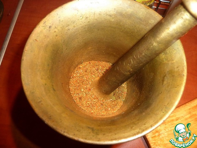 Стейки нарезали, теперь займёмся специями. Лучше всего брать не молотые, а цельные пряности, они дольше сохраняют свой вкус и аромат. Возьмем смесь перцев горошком, немного кориандра, кардамон, щепотку розмарина, зиру и зёрна горчицы. Также добавим сушеные хлопья паприки, куркуму и немного мяты для свежести. Положим нашу смесь в ступку и аккуратно разотрём. Ох, какой изумительный аромат! Уже начинаем представлять, насколько вкусным получится мясо с такими специями.