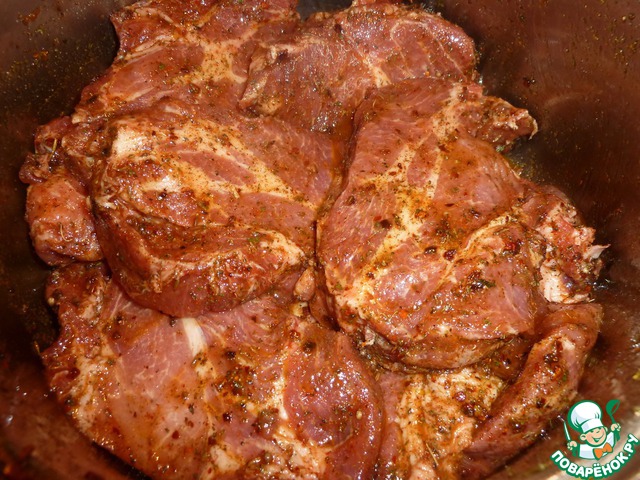 А теперь замаринуем мясо. Отправим его в кастрюльку, насыплем только что сделанные специи, посолим и нальём грамм пятьдесят оливкового масла. Кто-то может возмутиться: "Зачем же масло, свинина и так жирная!" Позволю себе не согласиться с таким доводом. Лишний жир у нас вытопится, а масло создаст тонкую плёночку, которая удержит в мясе все соки во время готовки. Хороший маринад, частенько таким пользуюсь. Он оставляет мясо сочным и сохраняет его естественный вкус. Ммм… Какая у нас получилась красота.