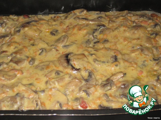 Заливаем грибным соусом и соусом, который остался от маринования свинины и в духовку при температуре 180С на 30-40 минут.
