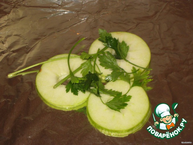На середину фольги выложить несколько пластиков яблока, на яблоко положить немного свежей петрушки, резать ее не надо, порвать крупно руками.