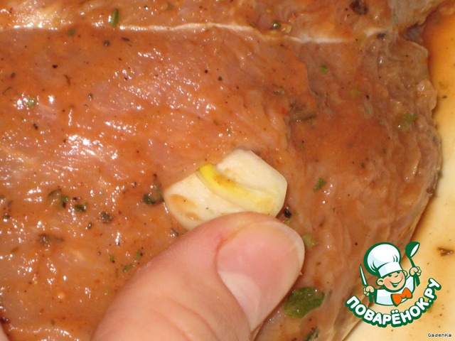 Тонким ножом сделать проколы лезвием ножа внутрь, вдоль волокон. В каждый прокол вставить чеснок.