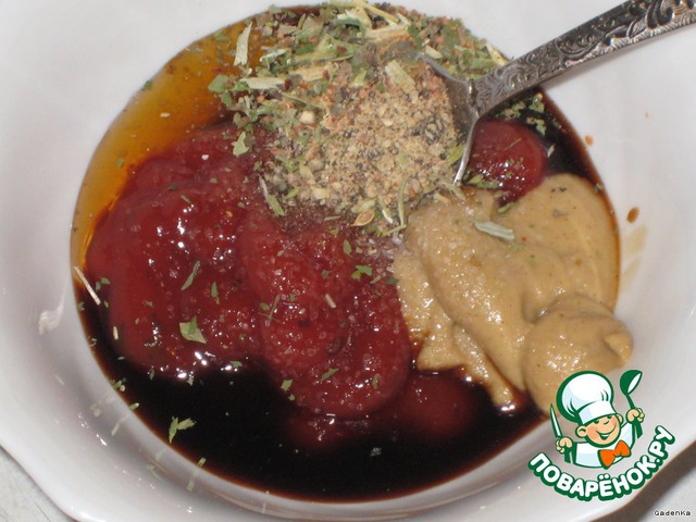 смешать томатную пасту, соевый соус, горчицу, мед, зиру, перцы, прованские травы (можно заменить на смесь сушеных базилика, тимьяна, орегано, майорана…) все хорошо перемешать