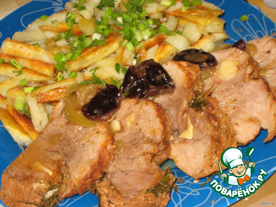 | Нежная и сочная свинина, запеченная в томатно-медовом соусе с яблоками и черносливом, чесноком и пряными травами. Я не едок свинины, но такую поела с удовольствием, особенно то, с чем запекалась. Даже мой консерватор муж, глядя на откровенно лежащие яблоки и чернослив на тарелке, мясо поглощал с великим удовольствием. Обычно он не знает с чем и как делалось блюдо, но сегодня решила показать, пусть он их не ел, мне больше досталось, но все в сочетании невероятно вкусно. |