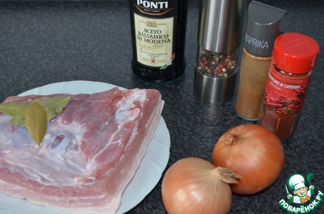 На этой же сковороде, обжарить лук, минут 5. Если после мяса осталось много жира, слейте (потом, на нём можно пожарить картошку, или яйца)! Добавить лавровый лист, соль, сахар, бальзамик, перец, мускатный орех. Перемешать, еще немного потушить и добавить воды, чтобы лук прикрыло жидкостью. Вскипятить и залить этим соусом мяско. После этого, грудинку протушить на маленьком огне, минут 25-30! Готово!