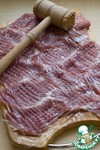 Накрыть кусочки мяса пленкой и отбить, что бы они стали толщиной около 3-5 мм.