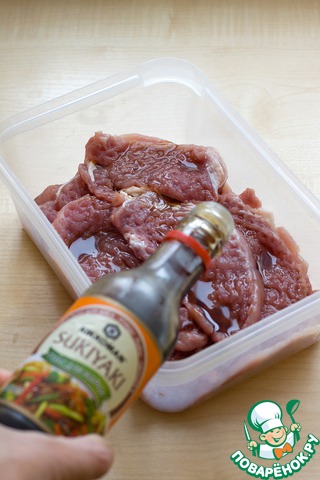 Замариновать мясо в соусе Kikkoman Teriyaki на 2 часа. К сожалению, я поздно обнаружила, что этот соус у меня закончился, поэтому мариновала в соусе для жарки Kikkoman Sukiyaki. Забегая вперед, скажу - очень понравилось! Восхитительный результат!