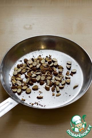 В рецепте предлагалось использовать кешью. В ближайшем магазине его не оказалось, поэтому заменила на миндаль. Итак, кешью (миндаль) порезать и обжарить на сухой сковороде.