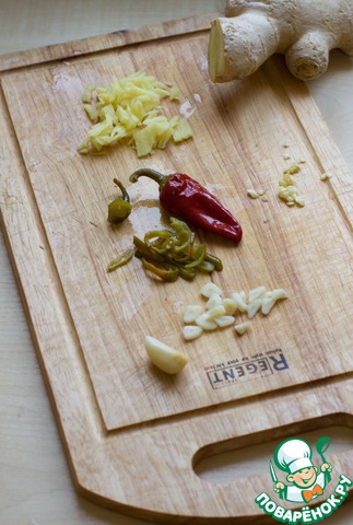 Морковь смешать с чили, чесноком и имбирем, перемешать, оставить мариноваться.