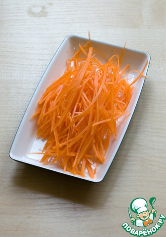 Нарезать вдоль очень тонко морковь, я использовала терку для корейской моркови.