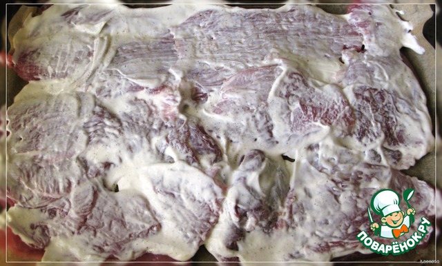 Мясо разделать на порционные куски, выложить на противень, посыпать специями и обмазать майонезом.
