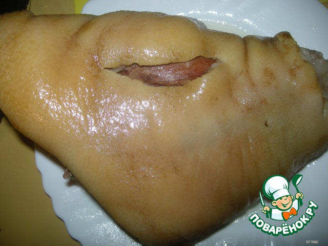 Рульку хорошо почистить и замочить в воде на ночь. Воду слить, залить новой и поставить варить. Рульку варим до готовности, (часа четыре) со всякими специями - луковица, морковка, лавровый лист, гвоздика, перец горошком, соль. Когда рулька остынет, вытаскиваем из бульона (кстати, из бульона получается отличный супчик).