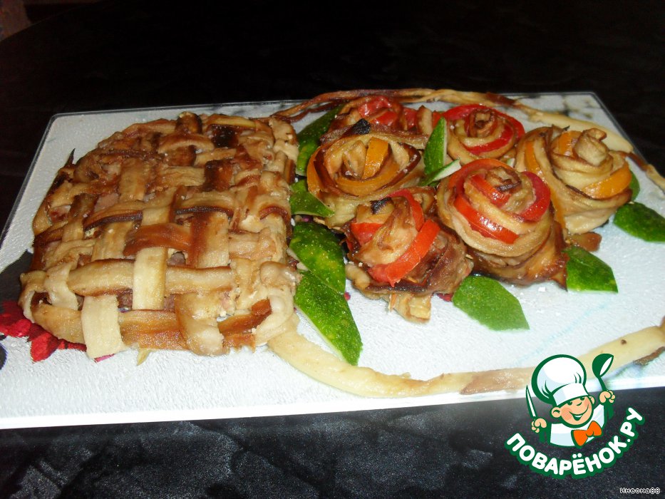 Начинаем украшать блюдо, ручку корзинки я также делала из баклажана. Подсаливаем по вкусу.