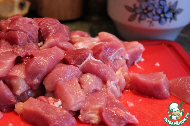 Мясо ополоснуть в холодной воде, нарезать на небольшие кусочки.