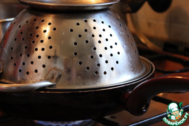 Для того, чтобы масло не забрызгало все вокруг накройте сковороду дуршлагом.