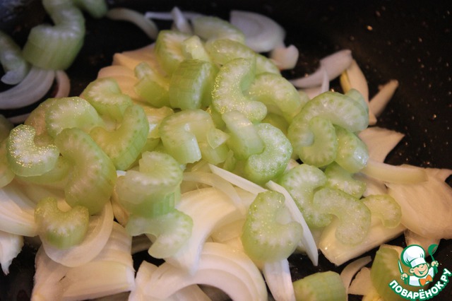 Лук нарезаем перышками, сельдерей крупно рубим. Обжариваем на растительном масле на медленном огне до мягкости примерно 10 минут.