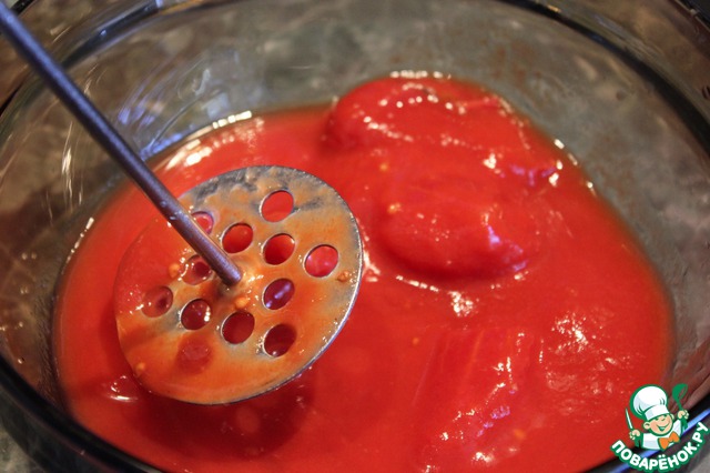 Томаты размять в миске и добавить их к тушеному луку и сельдерею. Тушить еще 5 минут.