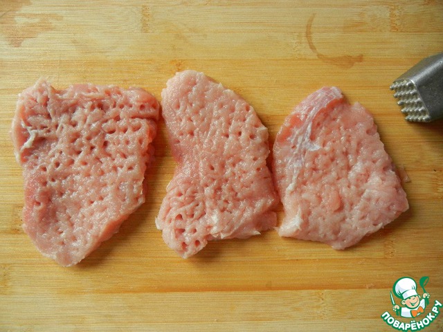 Мясо нарезаем тонкими ломтиками и отбиваем (можно не отбивать)