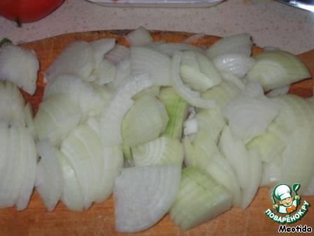 Лук чистим и нарезаем тонкими полукольцами (я полукольца еще разрезала пополам, очень уж луковица крупной была, а лук в моей семье не слишком любят)
