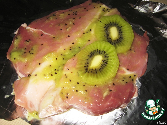 Обмазать кусочки мяса пюре киви со всех сторон.
