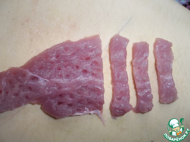 Затем, каждый кусочек режем на полосочки, шириной около 1 см.
