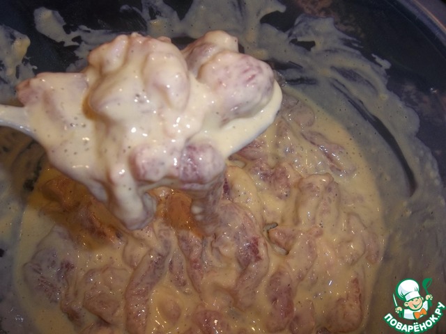 В смесь добавляем порезанное полосками мясо. Хорошо перемешиваем и отправляем в холодильник, минимум на 3 часа.