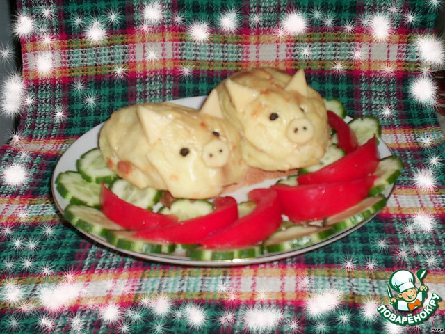 Сделать пятачок и ушки из сыра, глаза из горошков перца. Подавать с овощами и сметаной.