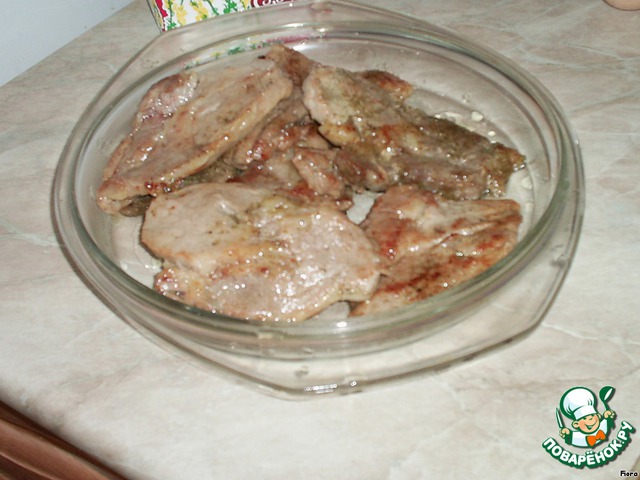 Мясо посолить, поперчить и обжарить на масле с двух сторон до полуготовности.