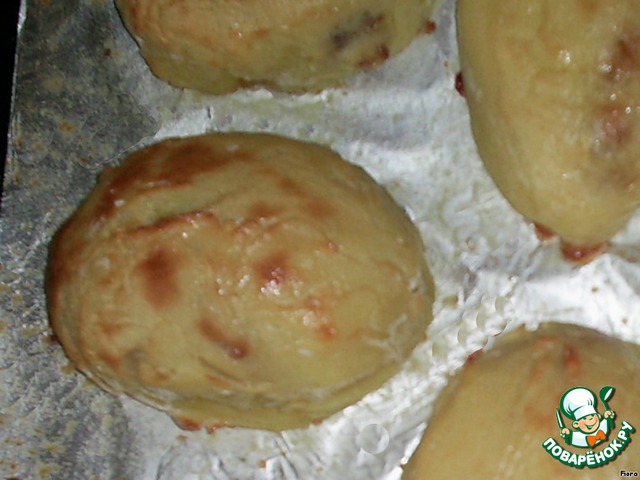 Уложить на фольгу, смазанную маслом и печь 15-20 мин. Как только начнут слегка зарумяниваться, смазать оставшимся взбитым яйцом. Запекать еще минут 15.