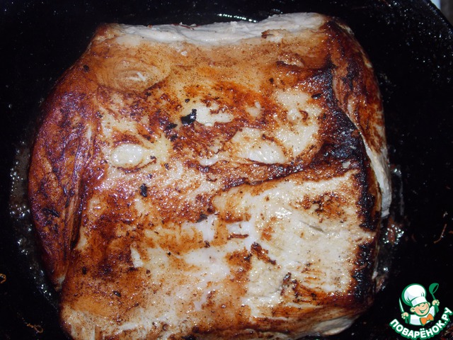 Затем на сильно разогретой сковородке обжариваем мясо со всех сторон.. Как бы запечатывая мясо..