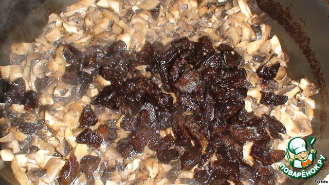Добавить на сковородку порубленный чернослив и тушить всё вместе под крышкой минут 5 - 7.