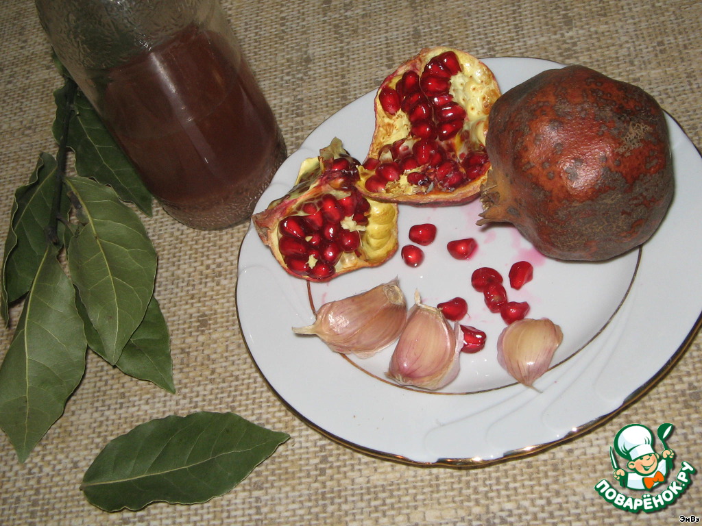 Для начала приготовим гранатово-чесночный соус. Это очень просто. Доступным вам способом выдавливаем сок из ягод одного граната, добавляем 2 (крупных) или 3 (мелких) раздавленных зубчика чеснока, солим - и соус готов.