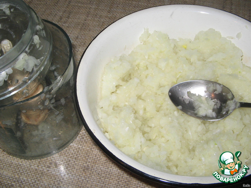 Пока варится мясо, почистим лук и нарежем его мелко или разобьем в каком-нибудь агрегате, я - в блендере