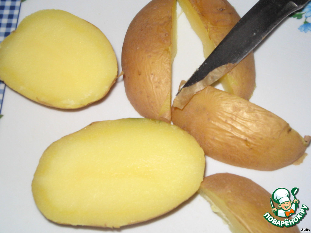 Картофель я готовлю так: тщательно мою клубни, отвариваю их до готовности и режу на четыре части