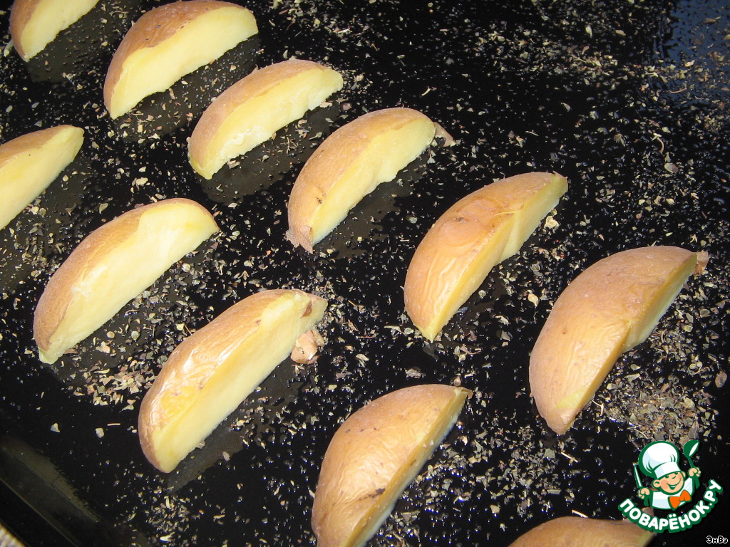 Противень смазываю растительным маслом, посыпаю душицей (орегано), солью, выкладываю на него картофель и...