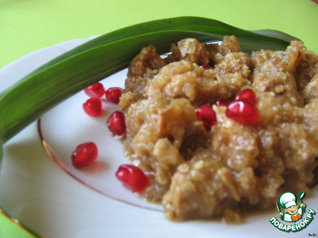 В отдельной посуде перемешиваем с гранатовым соусом (сначала, чтобы не переборщить, берем 3 ст.л.) пряности и добавляем их к мясу,
