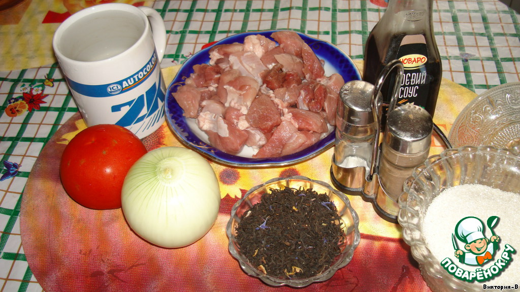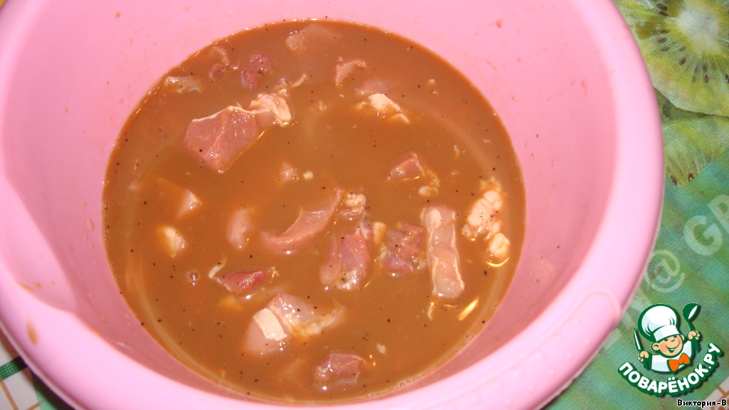 Добавить соль, сахар, перец и кусочки свинины. Мариновать 30 минут