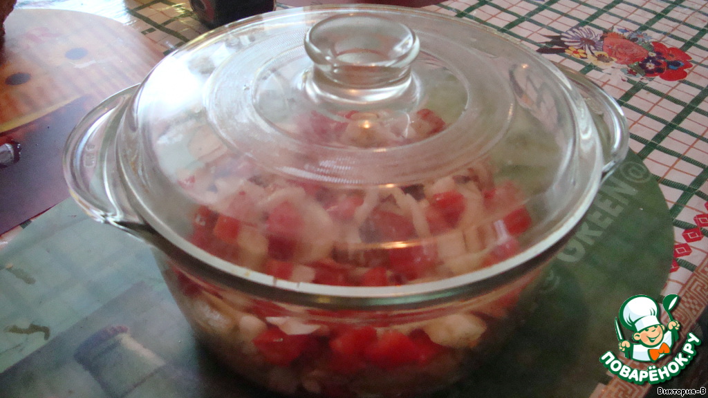 В форму для запекания выкладываем половину овощей, сверху мясо и вторую часть овощей, накрываем крышкой
