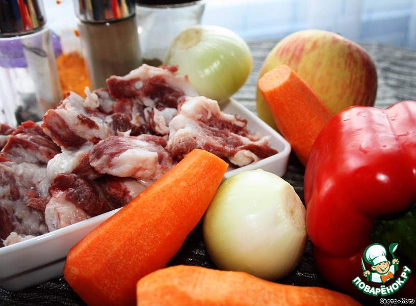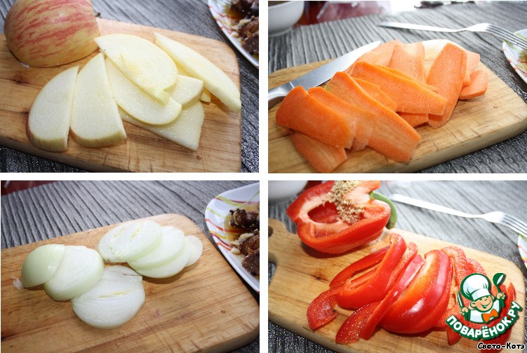 Нарезаем КРУПНО морковь, лук, яблоко, перец.