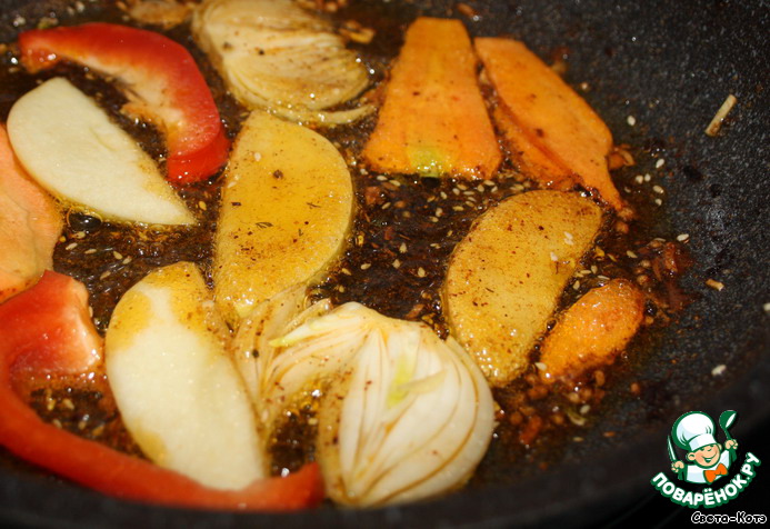 Вторую часть смеси приправ смешиваем с растительным маслом и обжариваем в нем подготовленные овощи-фрукты по полминутки с каждой стороны.