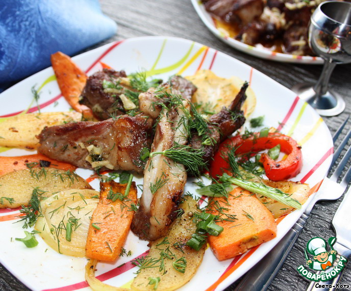 Выкладываем на тарелку по 1-2 ломтика обжаренных овощей и яблока. Сверху ребрышки, штучек 5 на порцию – в самый раз! Обильно посыпаем зеленью!