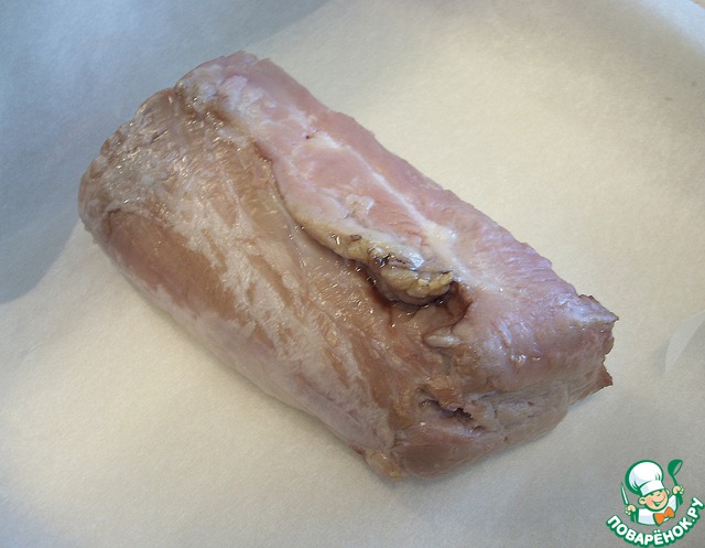 Извлечь ее из духового шкафа, температуру уменьшить до 180 гр. Тем временем прямоугольник из хлеба уже должен застыть (если нет, можно положить в морозилку ненадолго), края прямоугольника подрoвнять по форме вырезки. Кладем поверх мяса и немного придавливаем.