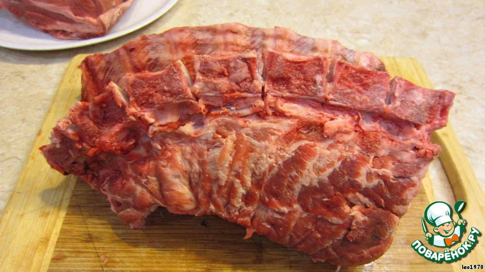 Для того, чтобы мясо можно было развернуть, положите кусок ребрами вверх и позвоночником к себе. Разрежьте соединительную ткань между позвонками. Я пошел дальше и удалил позвонки, освободив полностью от позвонка ребра.