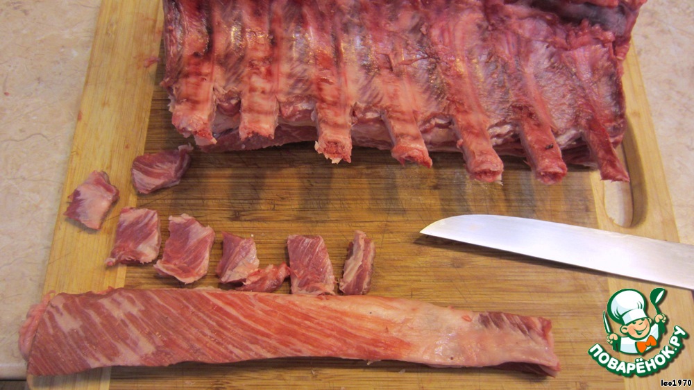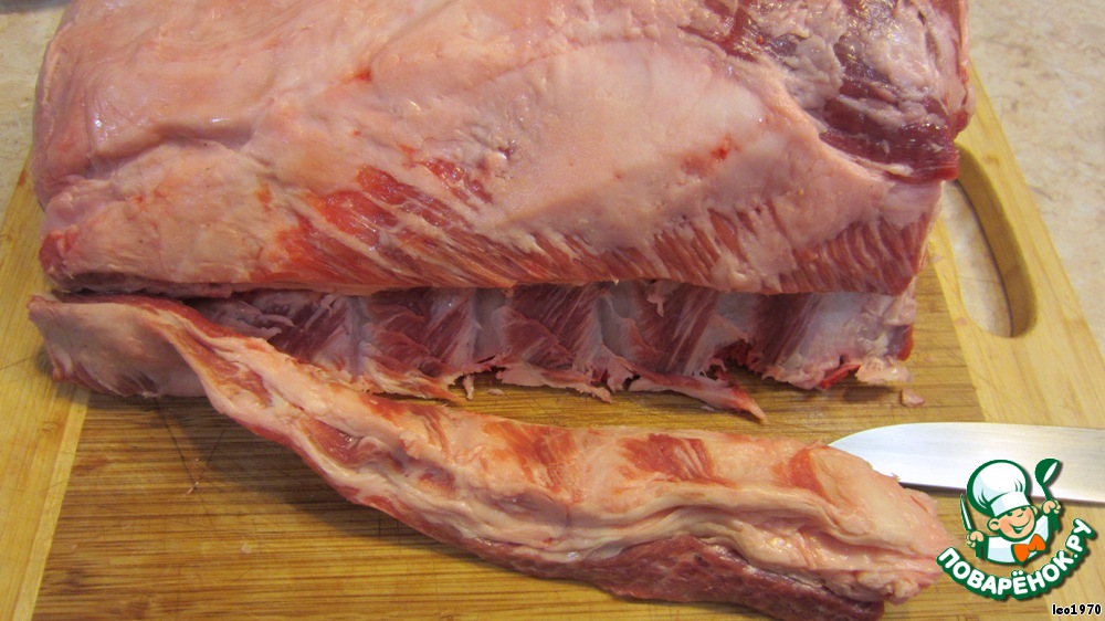 Тщательно уберите все осколки костей, срежьте все висящие кусочки мяса. Если у вас неодинаковые части - обрежьте мясо на бОльшем куске. Положите мясо ребрами вниз и позвоночником к себе. Срежьте гребни позвоночника и спилите их у позвонков, если они прикреплены.